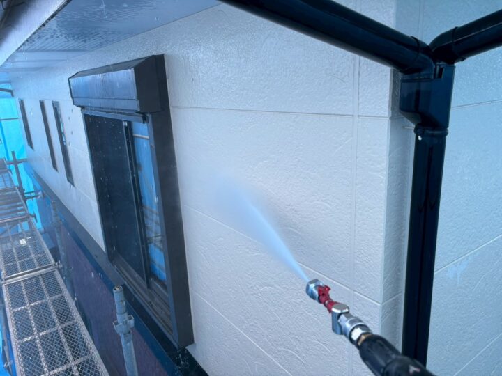 外壁についている汚れや垢などを、高圧洗浄にてきれいに洗い流していきます。