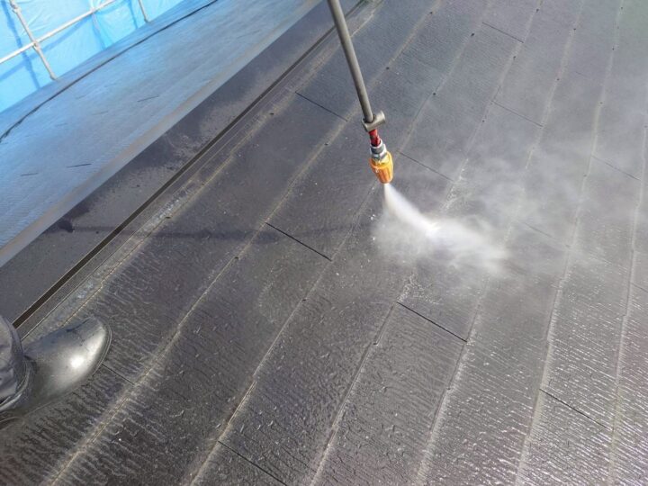 屋根についている汚れや垢などを、高圧洗浄にてきれいに洗い流していきます。古い塗膜を剥がし新しい塗膜を作るための大切な工程です。
