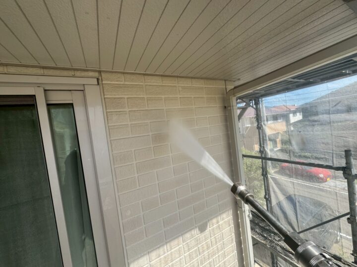 外壁についている汚れや垢などを、高圧洗浄にてきれいに洗い流していきます。