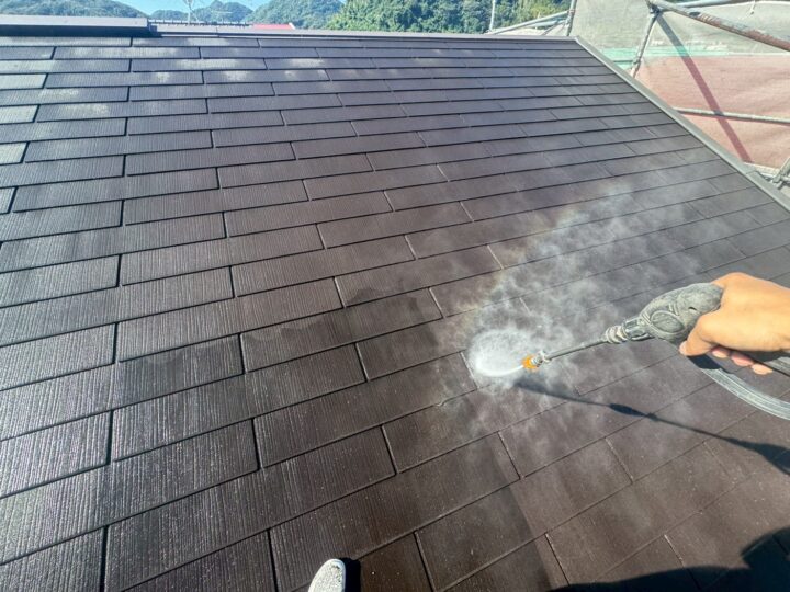 屋根についている汚れや垢などを、高圧洗浄にてきれいに洗い流していきます。古い塗膜を剥がし新しい塗膜を作るための大切な工程です。